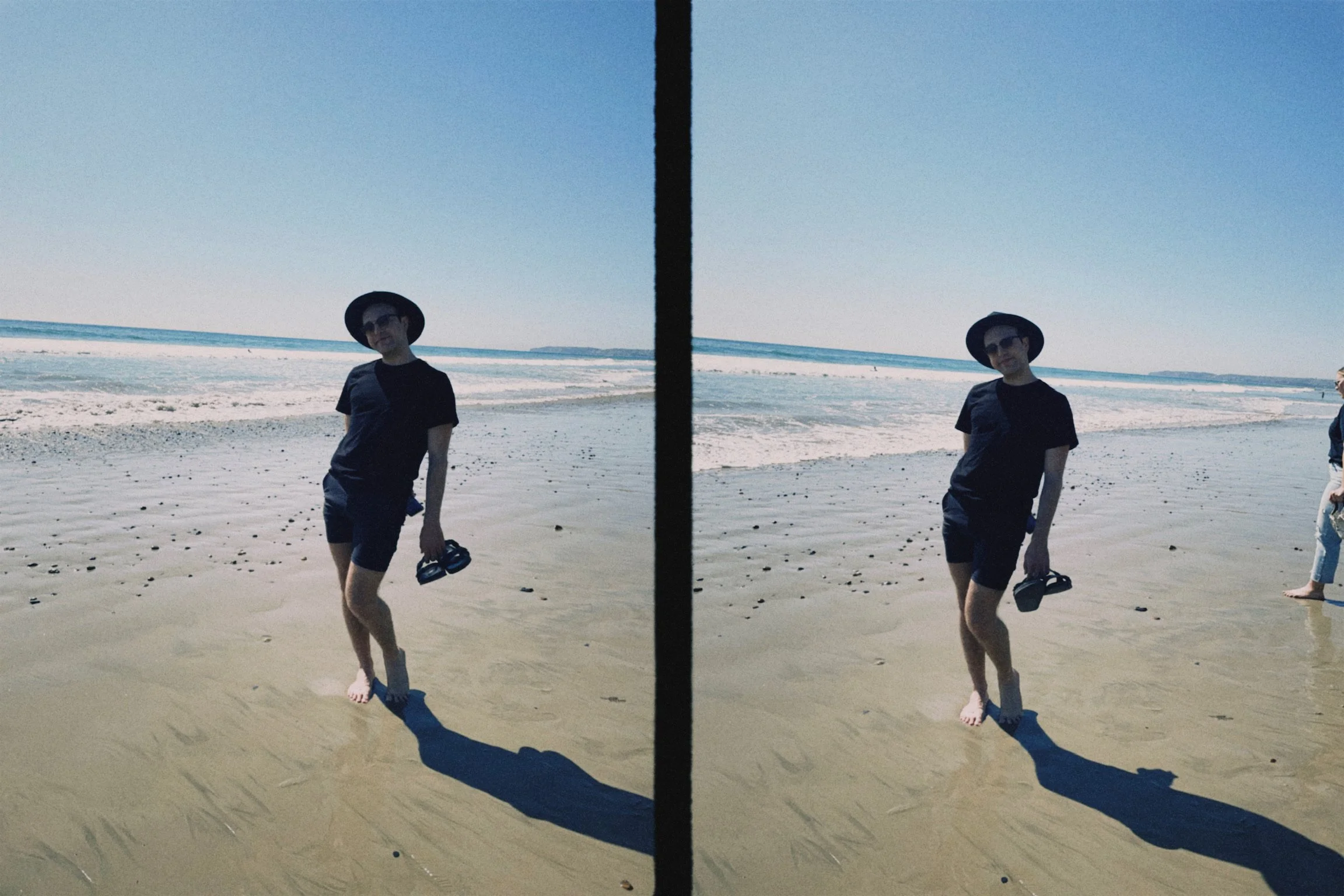 Cam on one of his travel excursions, soaking up the waves and sun with a little sashay.